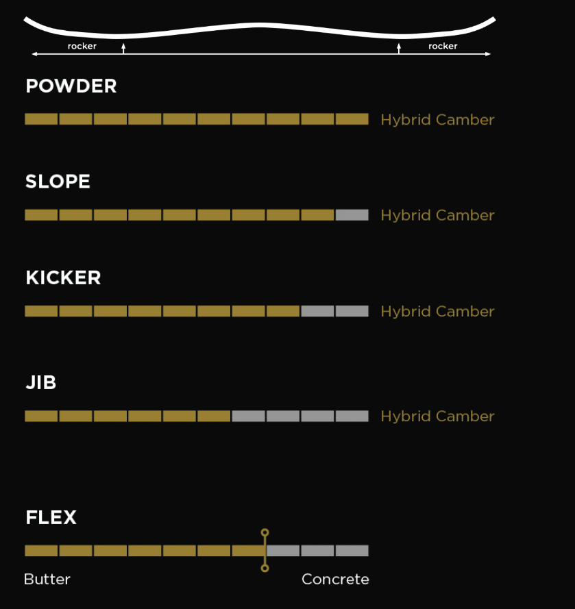 Directional Twin / All-Mountain Freestyle – een moderne all-mountain freestyle shape met genoeg directionele drive voor snelheid en carving, maar nog steeds speels en switch-vriendelijk voor freestyle en creatieve lijnen.