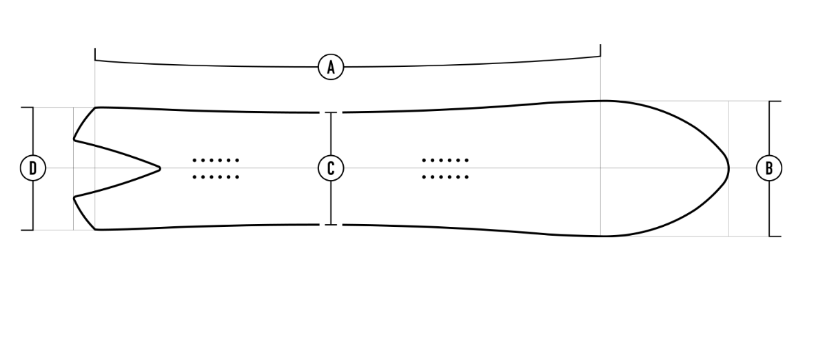 Directional Tapered (Swallowtail) - een uitgesproken directionele shape met brede nose, taper en swallowtail. De tail zinkt vanzelf wat weg in poeder voor extra float en snellere turns, en op groomers geeft de brede outline je super veel stabiliteit en ruimte om diep te leggen.