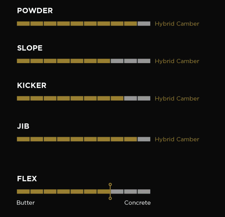 7/10 – medium-stiff: krachtig en precies, maar nog steeds speels genoeg voor freestyle, jumps en jib-inspired riding.