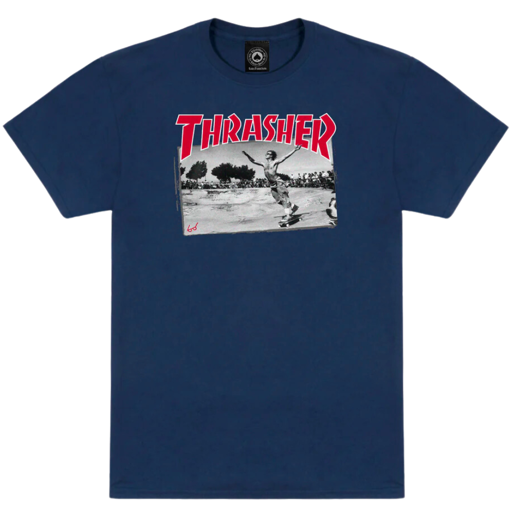 De Thrasher Jake Dish T-shirt Navy is een eerbetoon aan legende Jake Phelps, de onvergetelijke en invloedrijke redacteur van Thrasher Magazine. Met zijn middelzwaar materiaal, een normale pasvorm, en elastische crew nek, biedt dit T-shirt zowel comfort als stijl.