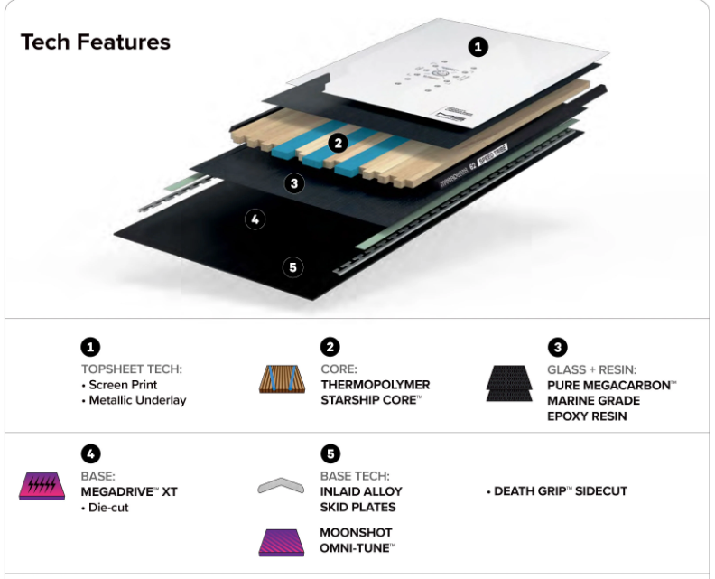 Thermopolymer Starship Core - een ultralichte kern die kracht en snelheid in balans brengt zonder in te leveren op duurzaamheid. Versterkt met pure megacarbon marine grade epoxy resin, biedt deze kern een ongekende levendigheid en pop, waardoor je snowboardervaring naar een hoger niveau wordt getild.