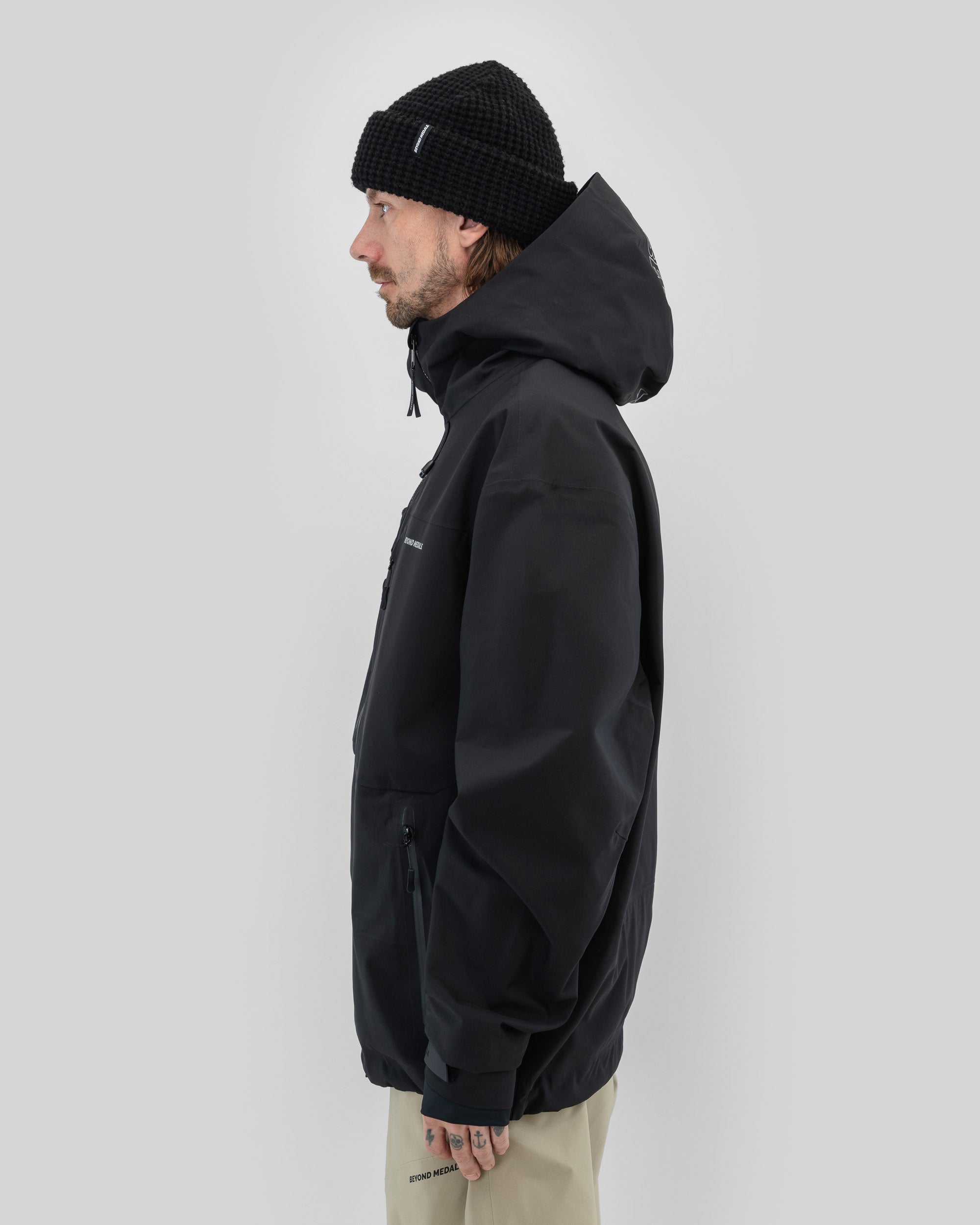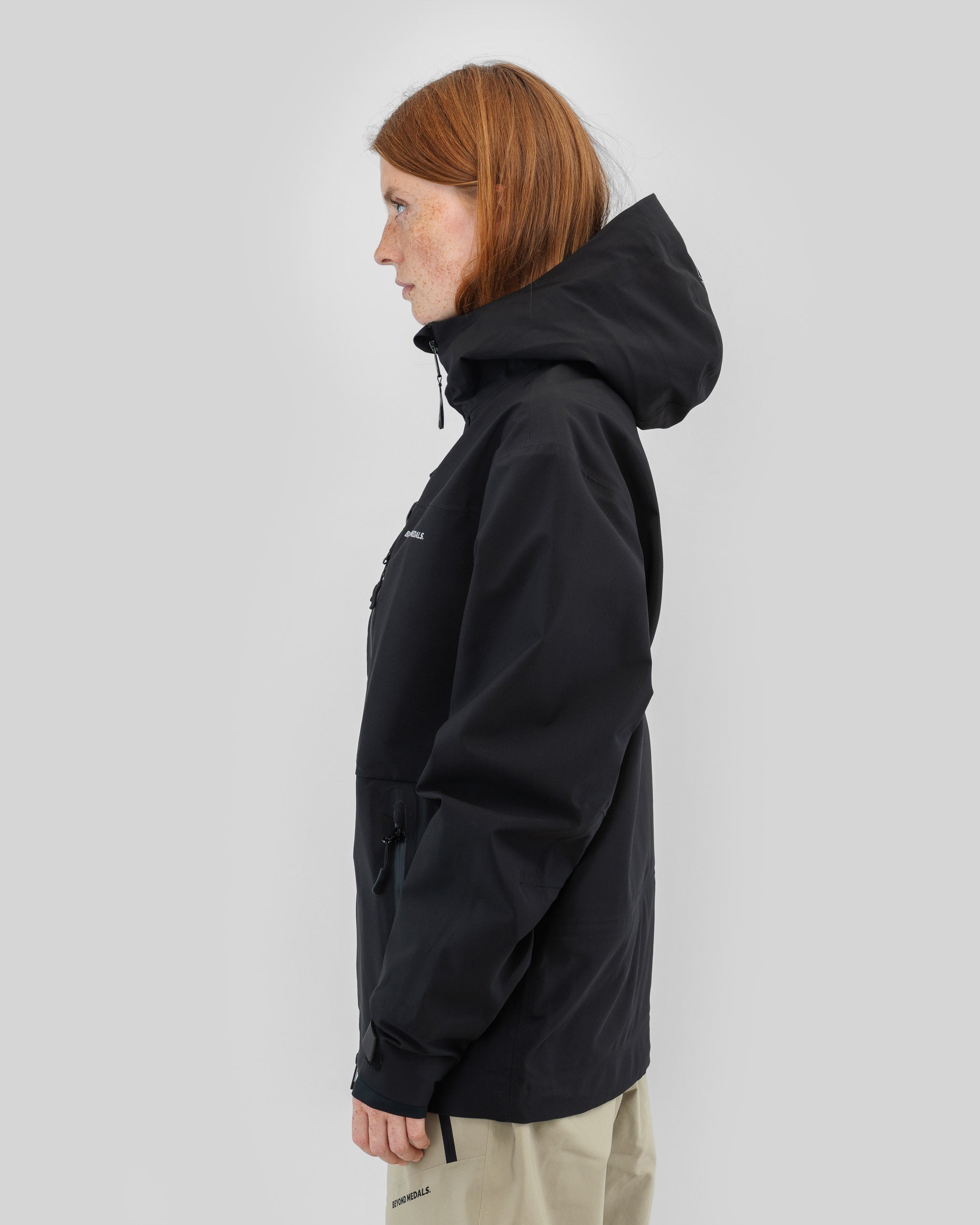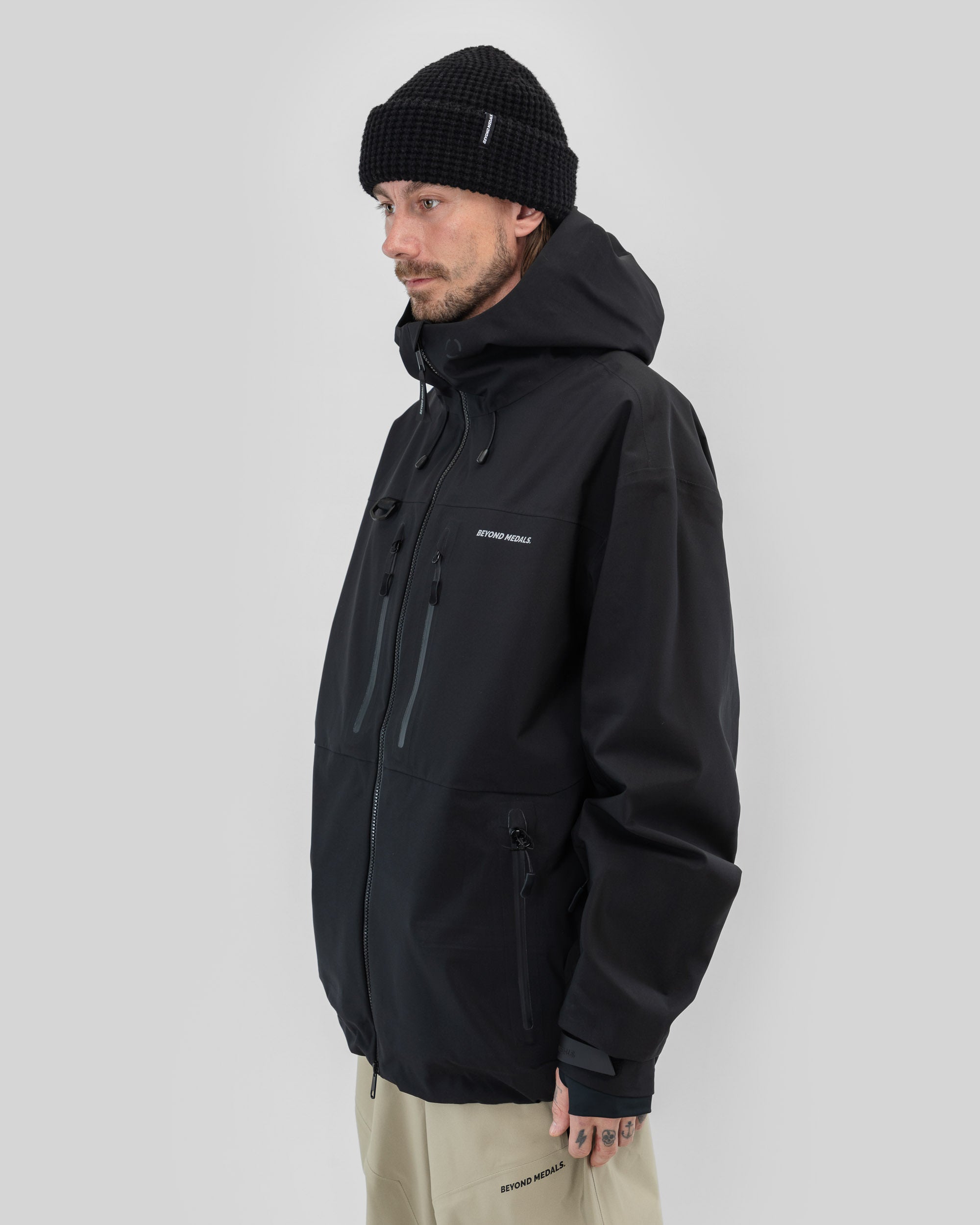De Beyond Medals Pro Tech Jacket 3L Black is een 3-laagse shelljas, ontworpen voor de zwaarste omstandigheden. Gemaakt van 100% gerecycled polyester, biedt hij een waterdichtheid van 20.000 mm, PFC-vrije DWR, volledig getapete naden en waterdichte ritsen voor volledige bescherming. Tors favoriete jas, gecombineerd met verschillende laagjes, afhankelijk van de omstandigheden.