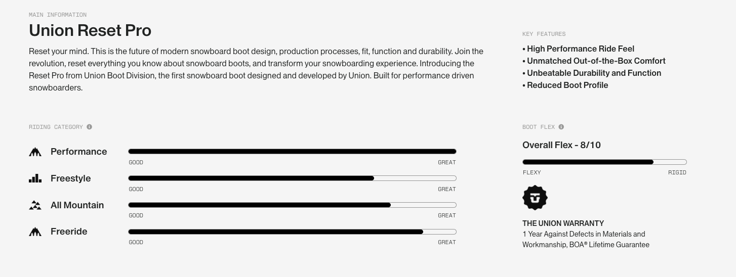 De Union Reset Pro Black Snowboard Boots zijn ontworpen voor rijders die comfort én performance verwachten — dus we duiken wat dieper in de technische specs: flex, lacing‑system, footbed, sole, binding compatibiliteit en welke rider dit model past.